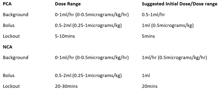 - Minimum 1 microgram/kg before initiating PCA/NCA, up to 50microgram/dose (>50kg)