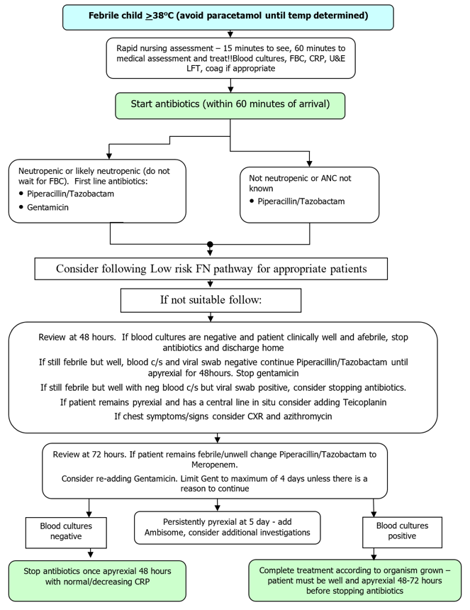 - Any child receiving chemotherapy who appears unwell but is not febrile or neutropenic may still need treating with antibiotics. If in any doubt as to whether antibiotics should be given it is usually preferable to err on the side of caution and give them. Discuss with more senior colleague if you are not sure.