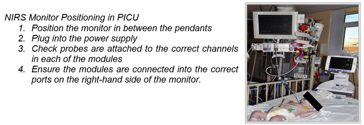 NIRS facilitates recognition of reduced or differential tissue perfusion which occurs during and following cardiac surgery during which time infants are at risk of Low Cardiac Output State (LCOS) which is associated with multi-organ dysfunction (i.e. acute kidney injury, cerebral injury), increased mortality and morbidity. NIRS may also have a role in the management of patients with sepsis, traumatic brain injury, post-cardiac arrest management and those on ECMO. Interpretation of NIRS allows optimisation of various management strategies to address the balance between tissue oxygen delivery (i.e. optimising oxygenation and haemoglobin concentrations, cautious use of fluid and inotropes) and reducing metabolic demand (i.e. pain relief, sedation and temperature control). In those with balanced cardiac conditions NIRS provides a valuable bedside indicator regarding Qp:Qs balance , which describes the magnitude of a cardiovascular shunt (i.e. normal = 1:1, left to right shunt = >1.0 and right to left shunt = <1.0).