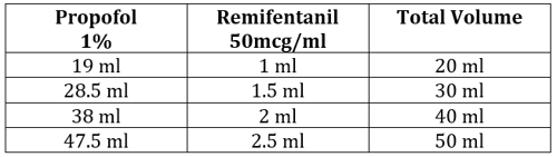 - 2.5ml of this remifentanil is added to 47.5ml of 1% propofol