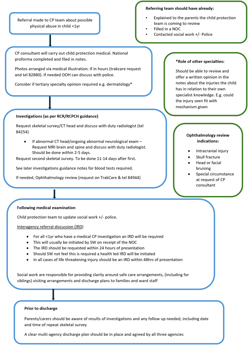 The investigations outlined in the flow chart above are the standard investigations carried out as part of a child protection investigation. Other investigations may be required depending on the injuries the child has, or the concerns raised. If a child has presented very acutely unwell they may also be having other investigations or treatment for possible medical conditions until more information is available.