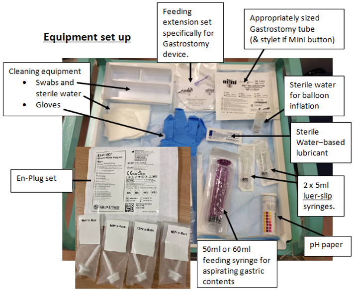 - Appropriate sized replacement gastrostomy tube (calibre and length) available