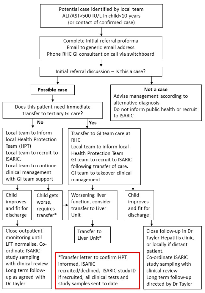 This is a working case definition and subject to change. Note the PHS definition differs from the UKHSA definition. Please refer to the latest PHS updates to confirm. There should also be a low threshold for discussing with the GI team at RHC Glasgow any child up to 16 years who presents with transaminases >500 IU/L with no alternative diagnosis.